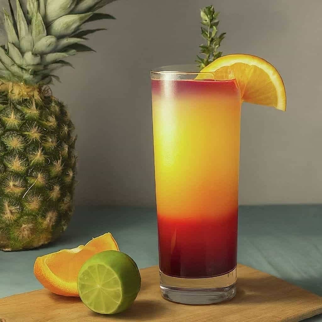 - Buz dolu bir kokteyl çalkalayıcısına portakal suyu, ananas suyu, limon suyu ve grenadin şurubunu ekleyin.