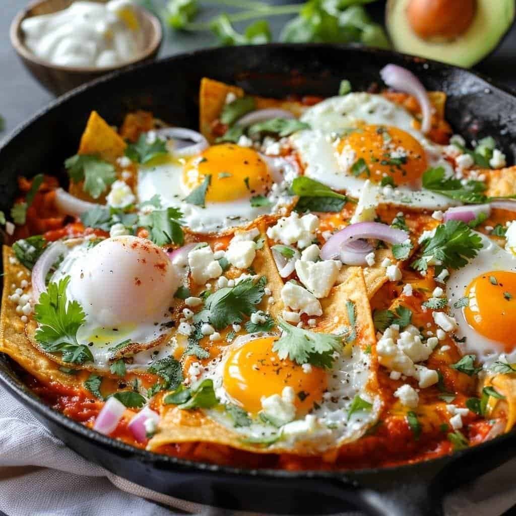 Servis: Chilaquiles’in üzerine yumurta, kaşar peyniri, krema, kişniş, soğan ve avokado dilimleri ekleyip servis edin.