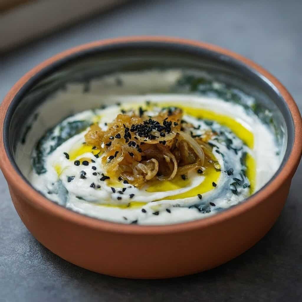 - Hazırlanan yoğurt, kavrulmuş soğan ve pazıları bir kapta birleştirin ve iyice karıştırın.