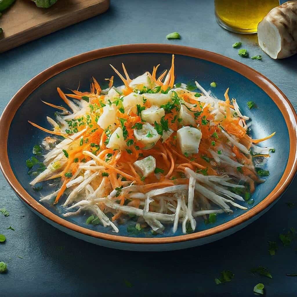 - Servis tabağına havuç rendesini, hazırladığınız kerevizli karışımı ve doğradığınız yerelmalarını yerleştirin.